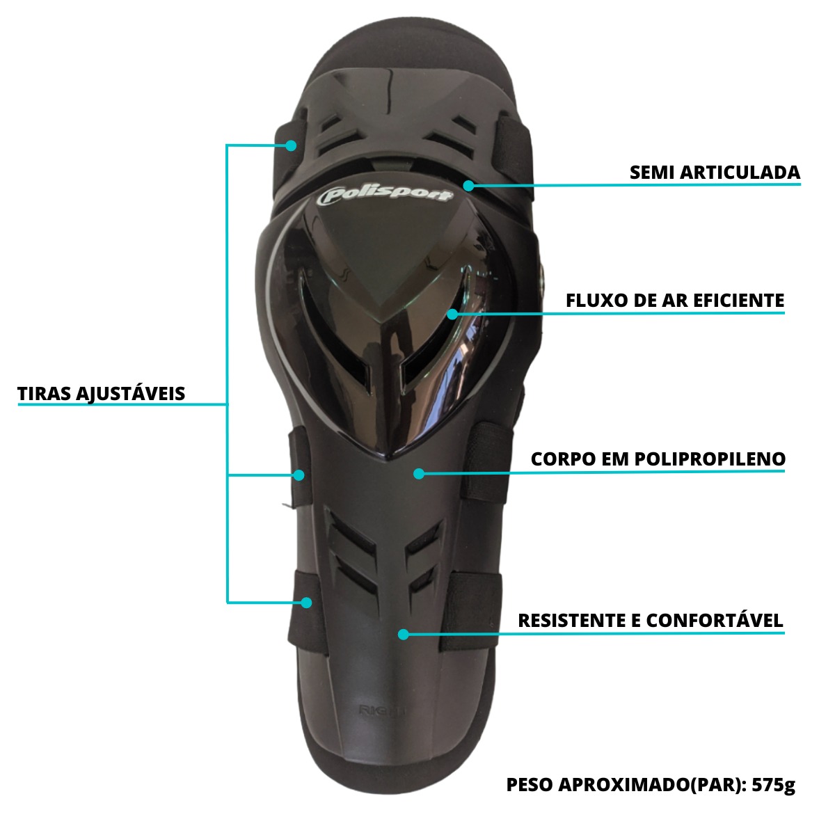 Fabricada em polipropileno de alta resistência, a joelheira conta com sistema articulado que acompanha o movimento natural do joelho, garantindo mobilidade sem comprometer a proteção. Seu design ergonômico aliado ao sistema de ventilação proporciona maior conforto durante o uso prolongado, mesmo em condições intensas.