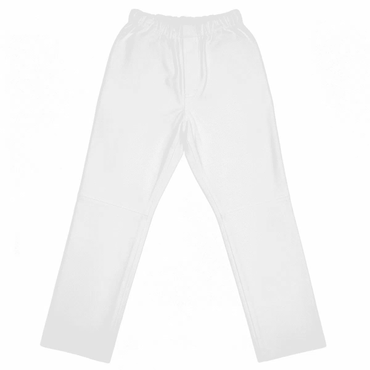 Calça Teknoluvas confeccionada inteiramente em raspa grupon, com passantes para cinto ou sistema de amarrar. É costurada com linha de algodão e possui elásticos na cintura e na barra, deixando o usuário confortável e seguro.